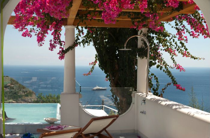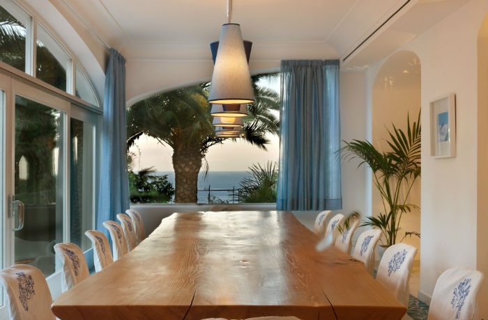 The villa is built over three levels: on the ground floor, there is a large hall that opens onto two living-rooms and a beautiful dining room, whilst the upper floors contain the bedrooms and panoramic terrace with solarium and whirlpool with infinity edge. The terrace boasts a unique view of the sea, one of the best of the entire coast. We recommend this property to families and travellers who love the buzz yet want to go back home to a safe and private place in the evening, as well as to all who love great food – the famous Spaghetti alla Nerano, a symphony of zucchini, herbs and grana Padano are the typical dish here. This little bay hosts the Taverna del Capitano, a Michelin starred restaurant.