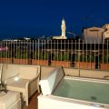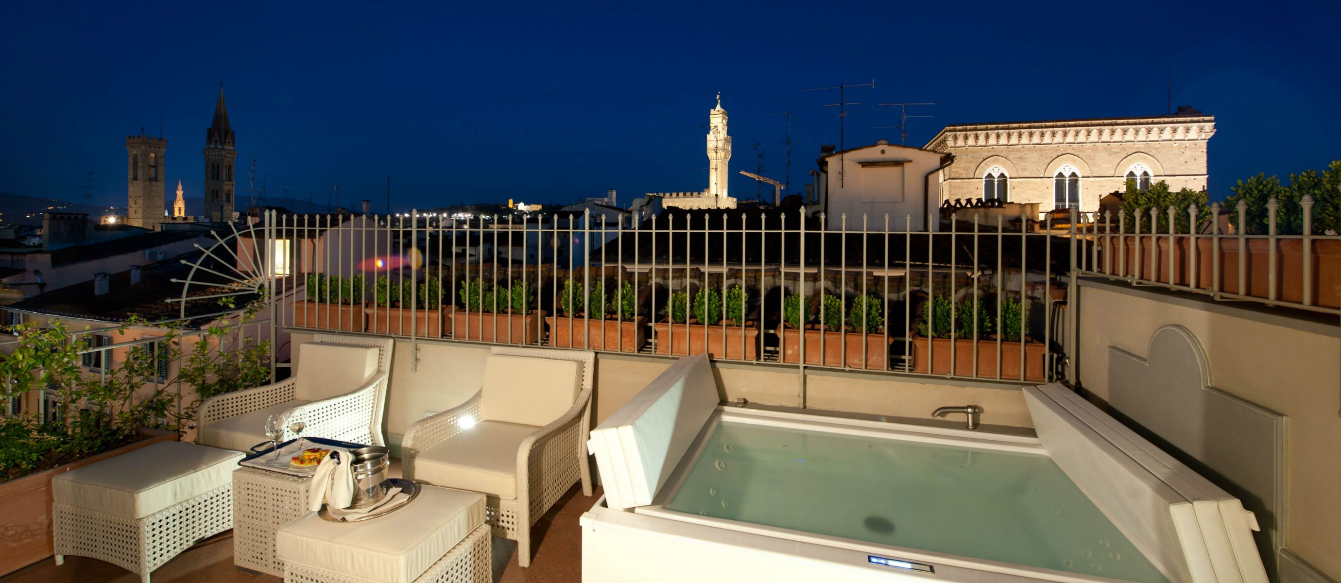 This amazing duplex Suite in Florence is composed by a ground floor with a livingroom and a full marble bathroom, and by a first level with a kingsize four poster bed and a gorgeous terrace of 20 sq.m. / 215 sq.ft equipped with a Jacuzzi tub. Upstairs you can enjoy a fabulous view of Brunelleschi’s Cupola, Giotto Tower and Palazzo Vecchio; the size of the suite is 55 sq.mt / 592 sq. ft.