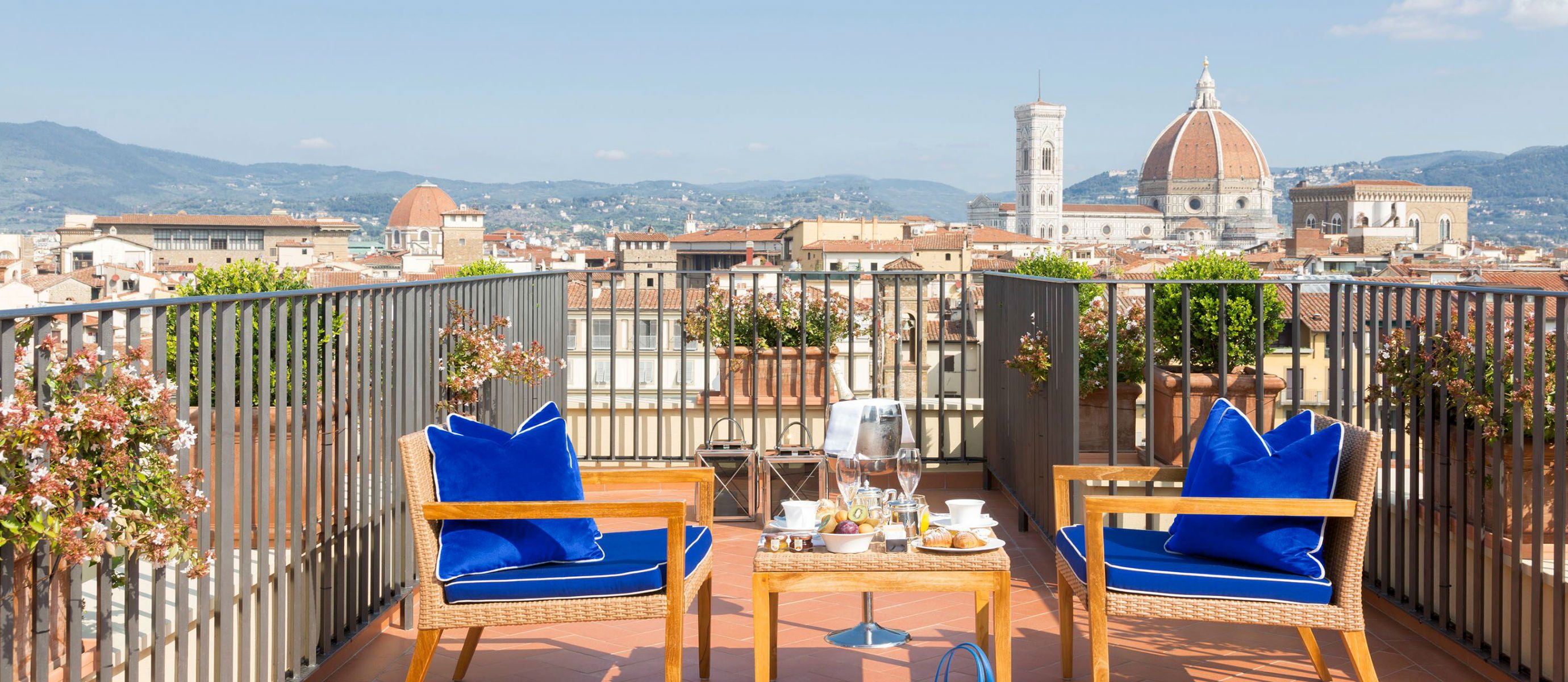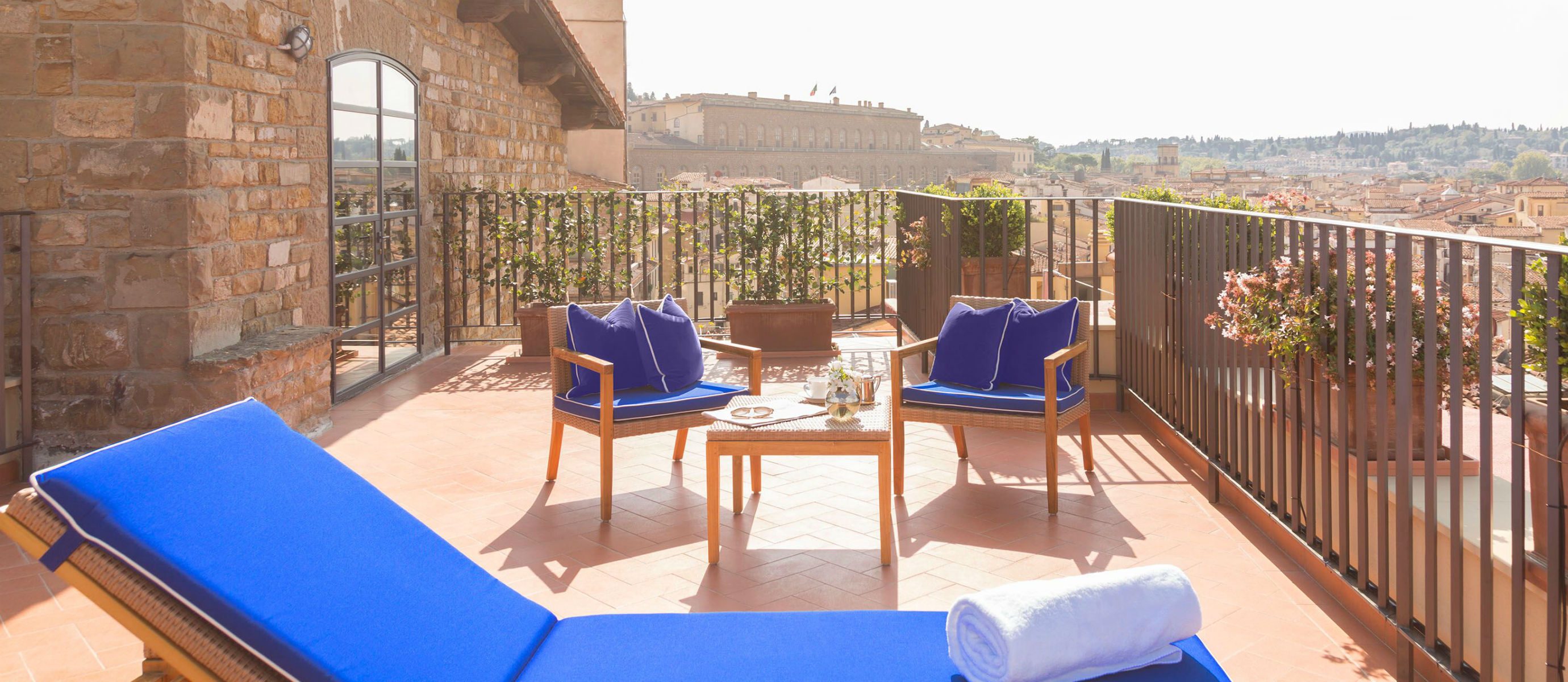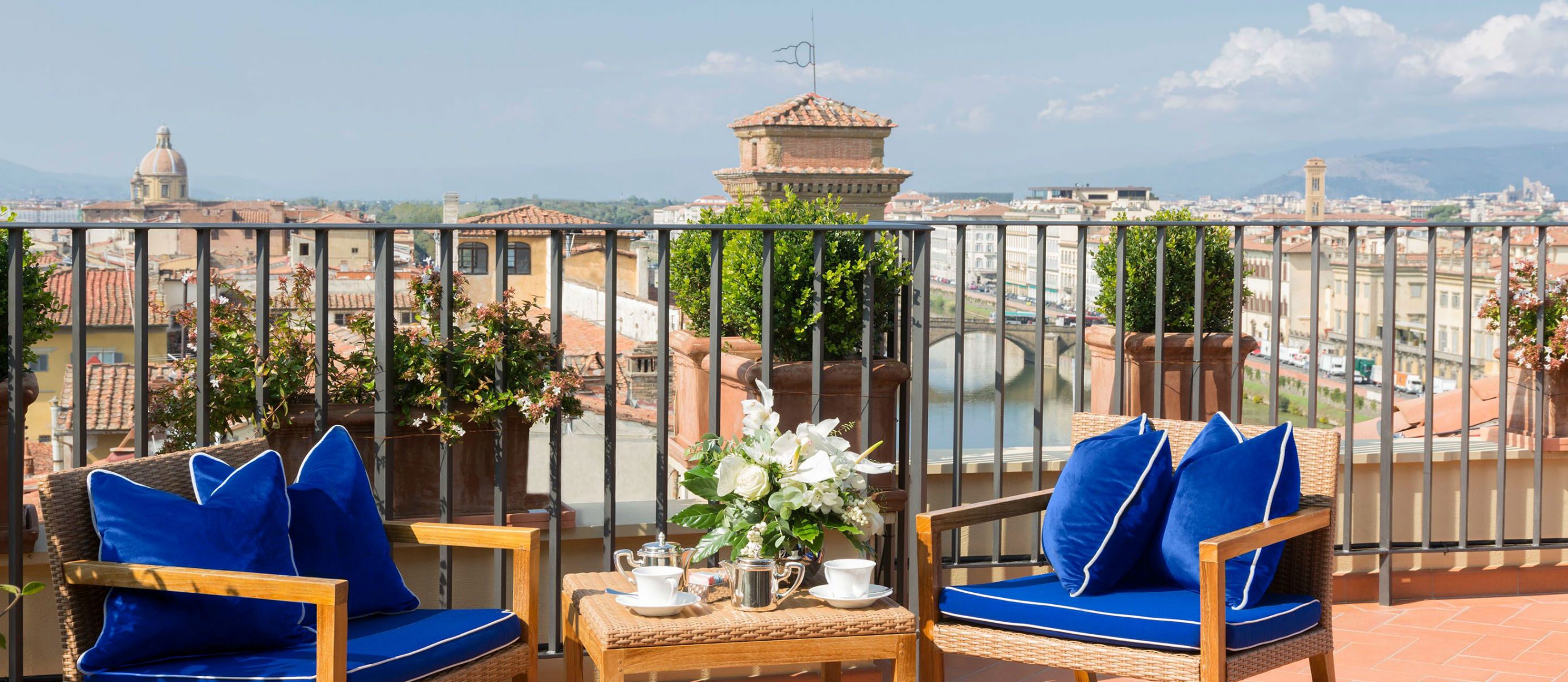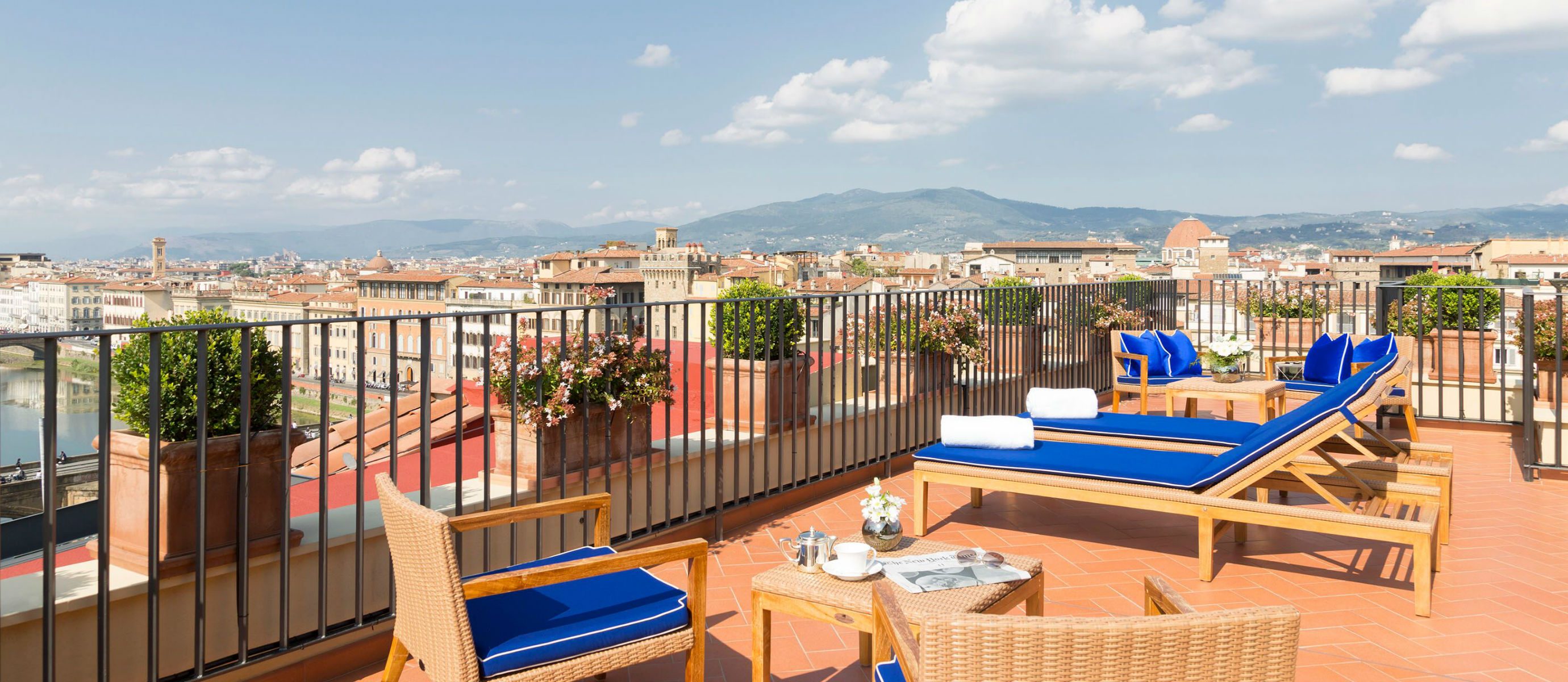 Enjoy a breathtaking, 360-degree view of Florence from the new Rooftop Terrace Suite. Observe the landscape from Palazzo Pitti to the Santa Trinita Bridge, swim in the reflections of our city on the Arno and Ponte Vecchio, and get lost in the splendor of Brunelleschi’s Dome of the Cathedral of Santa Maria del Fiore and Santa Maria Novella. This is more than what you would expect from the private terrace of the new Rooftop Terrace Suite at Hotel Lungarno.