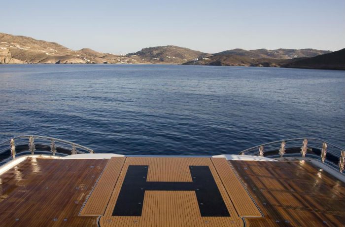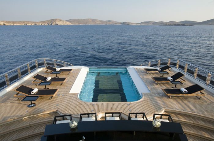 Alfa Nero has a large infinity swimming pool with a glass aft end. The floor of the swimming pool can be raised to offer a safer depth for children – or raised completely to become either a dance floor or a helicopter landing pad.