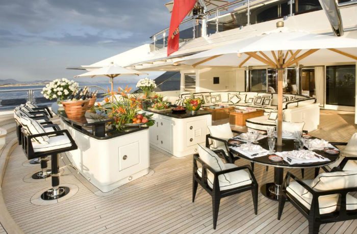 Alfa Nero won numerous design awards for her innovative approach to superyacht living, including her huge beach club area and swimming pool on the aft deck conceived by exterior designer Carlo Nuvolari, a design now incorporated into many subsequent yachts.