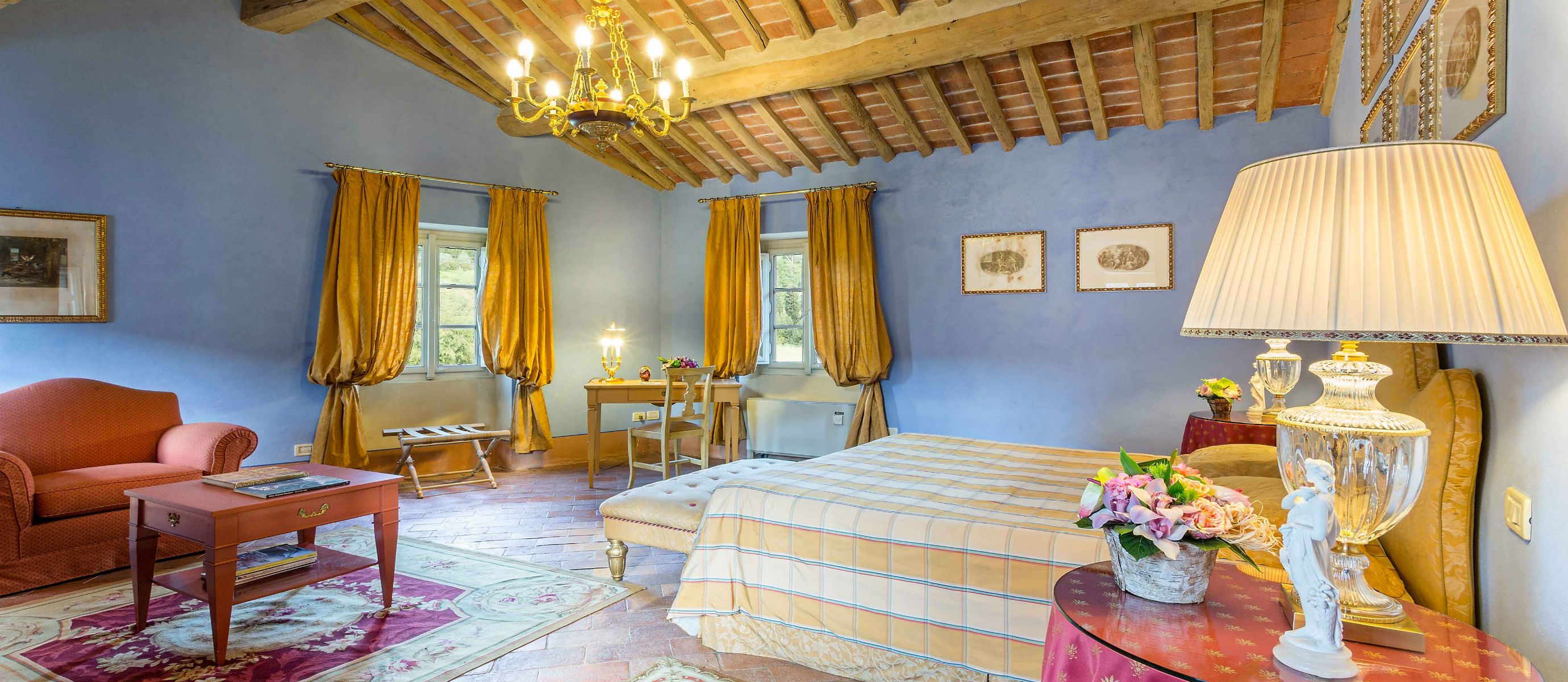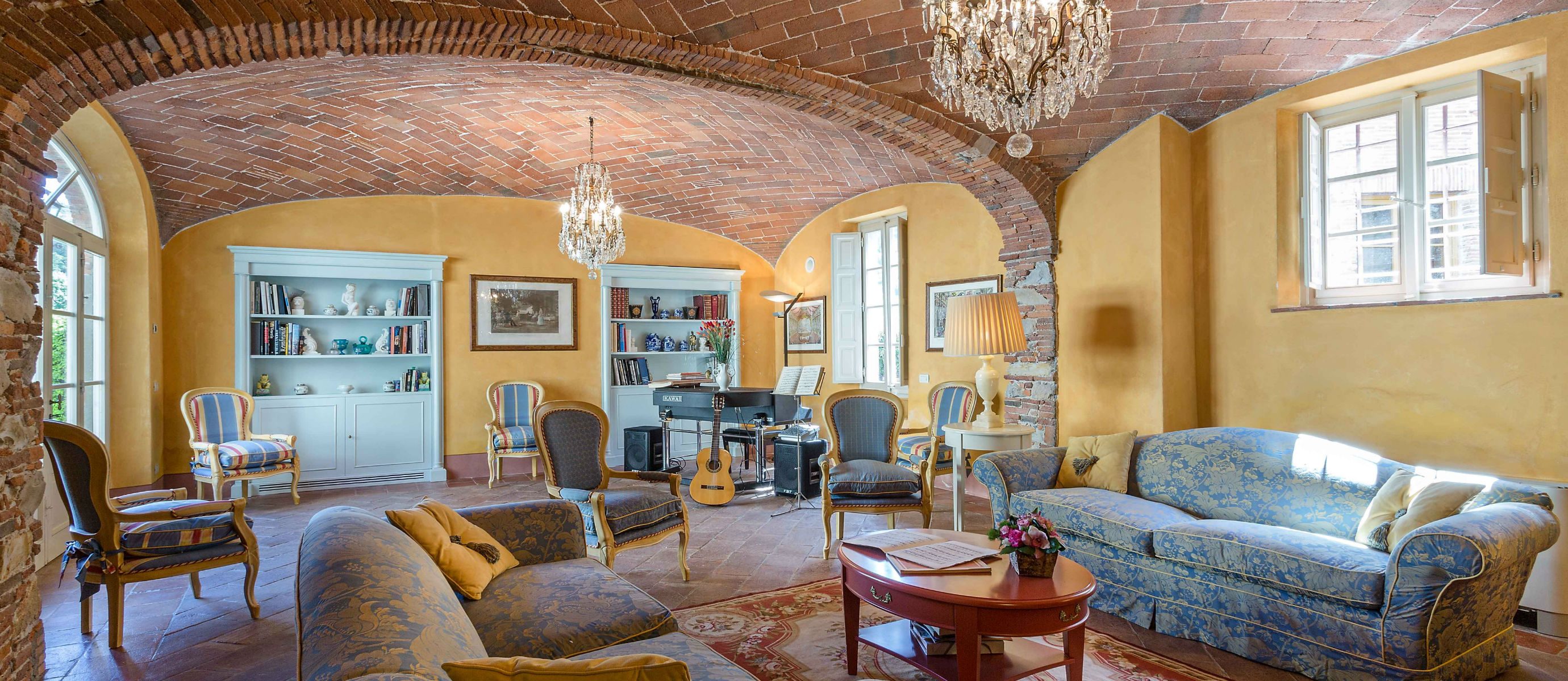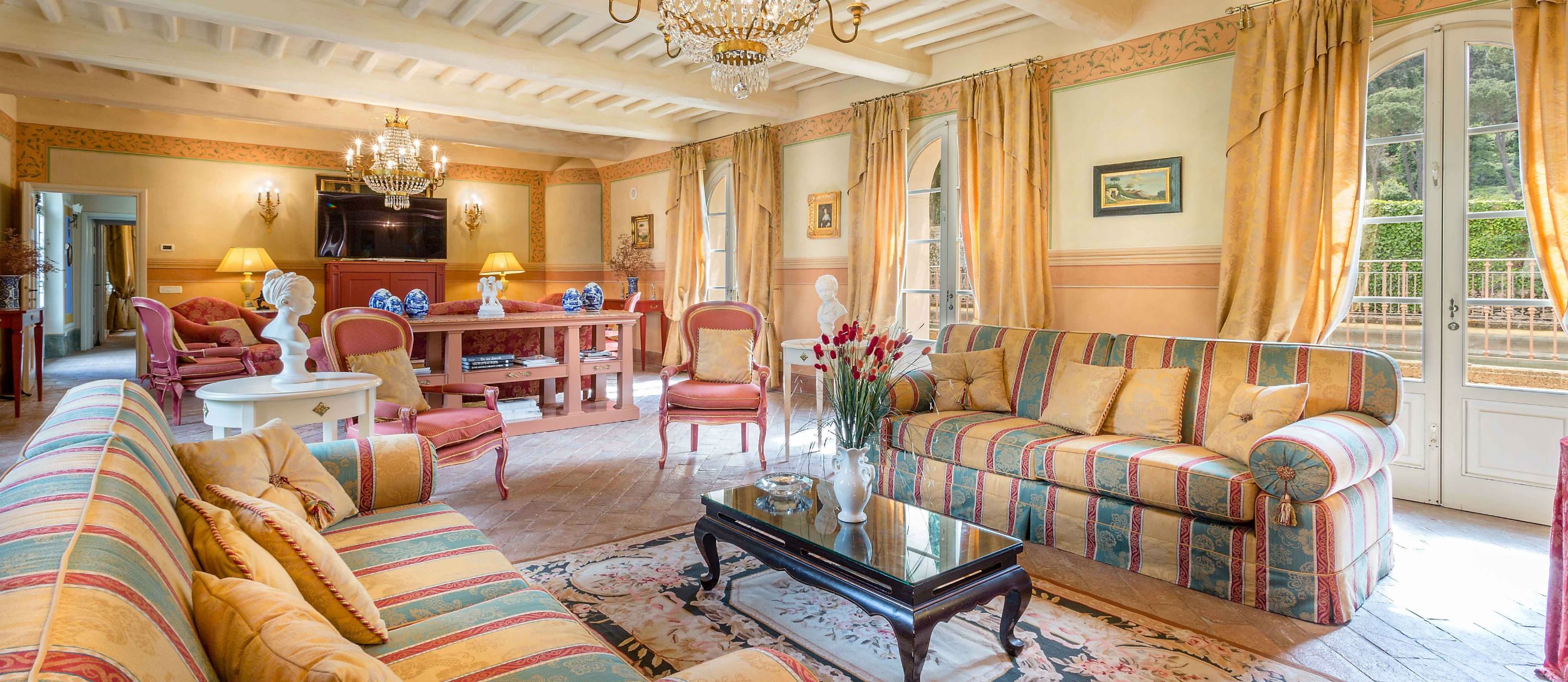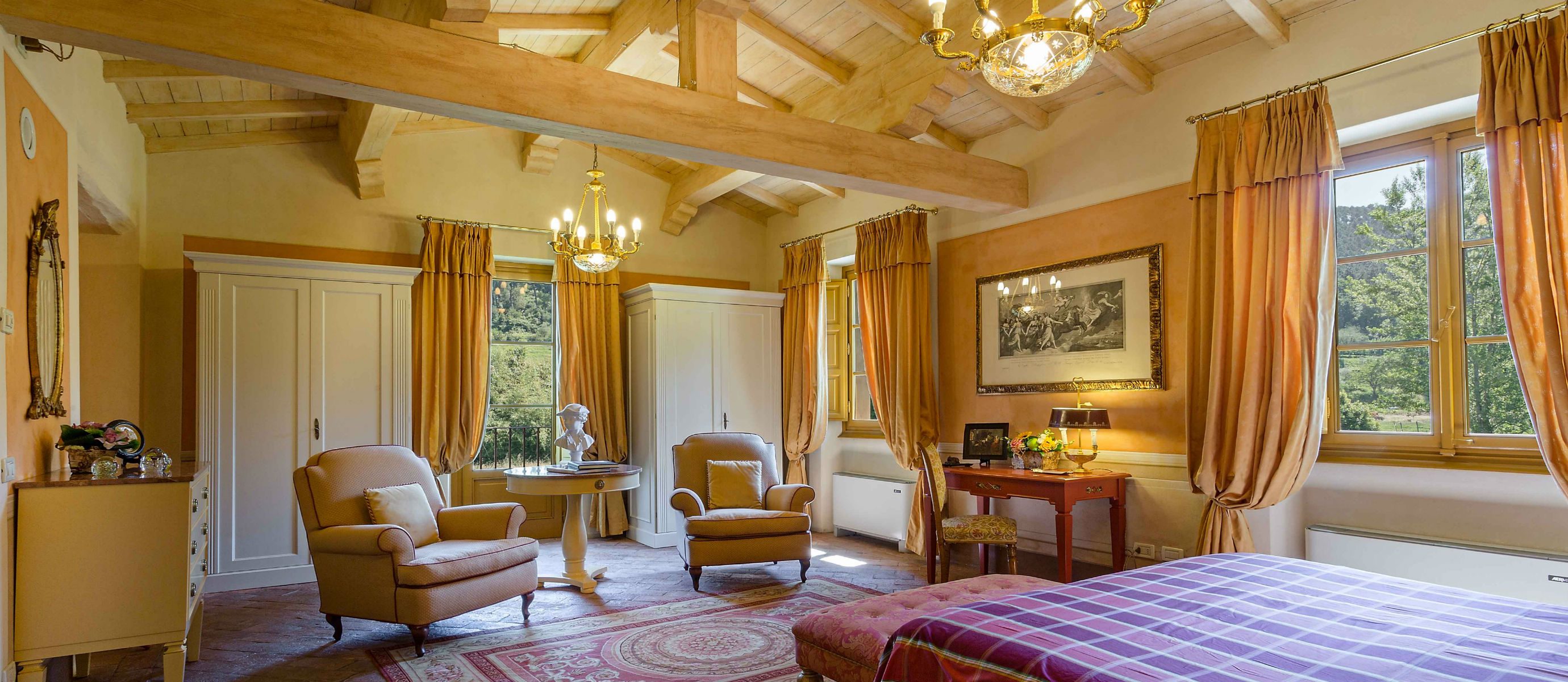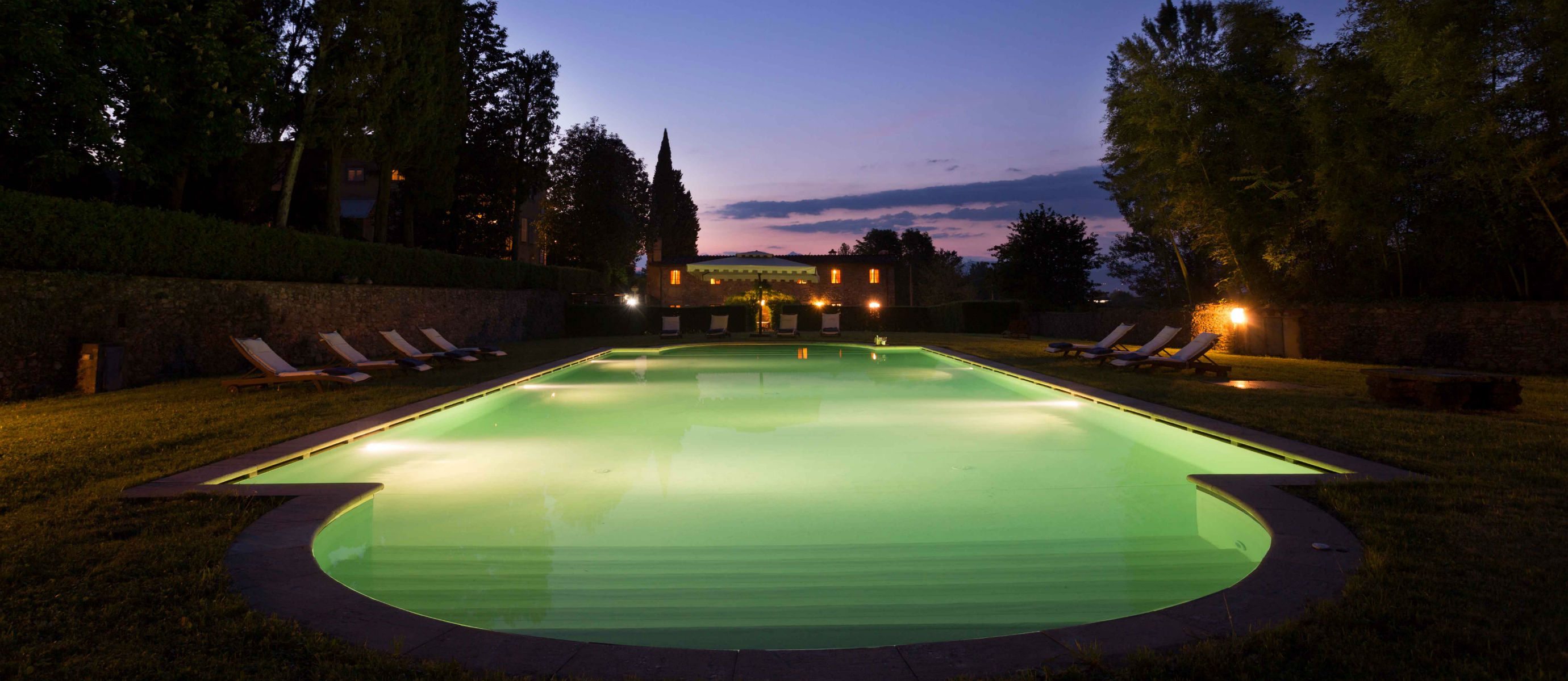 Centuries ago Count Bernardini created a haven in the hills that surround the ancient walled city of Lucca. Today Lucca Hamlet is an elegant and exclusive Tuscan retreat immersed in a splendid parkland of ornamental ponds and antique fountains, time-forgotten courtyards, and lemon-scented Italian gardens. The 12 individually styled bedrooms, accommodating up to 24 guests, are a reflection of gracious living blended discreetly with the typical Tuscan hamlet style of wood-beamed ceilings, terracotta floors, and warm, welcoming colours. The reception rooms include a wine library with a private collection of Tuscan wines, a card, and billiard room, a domed music room with a log fireplace, a grand banquet room, a large Tuscan kitchen, several comfortable lounges as well as a workout room. With original features and picturesque views over hills and olive groves, Lucca Hamlet is a home of beauty, tranquility, and charm… a perfect place for the gathering of family and friends where days are timeless and memorable.