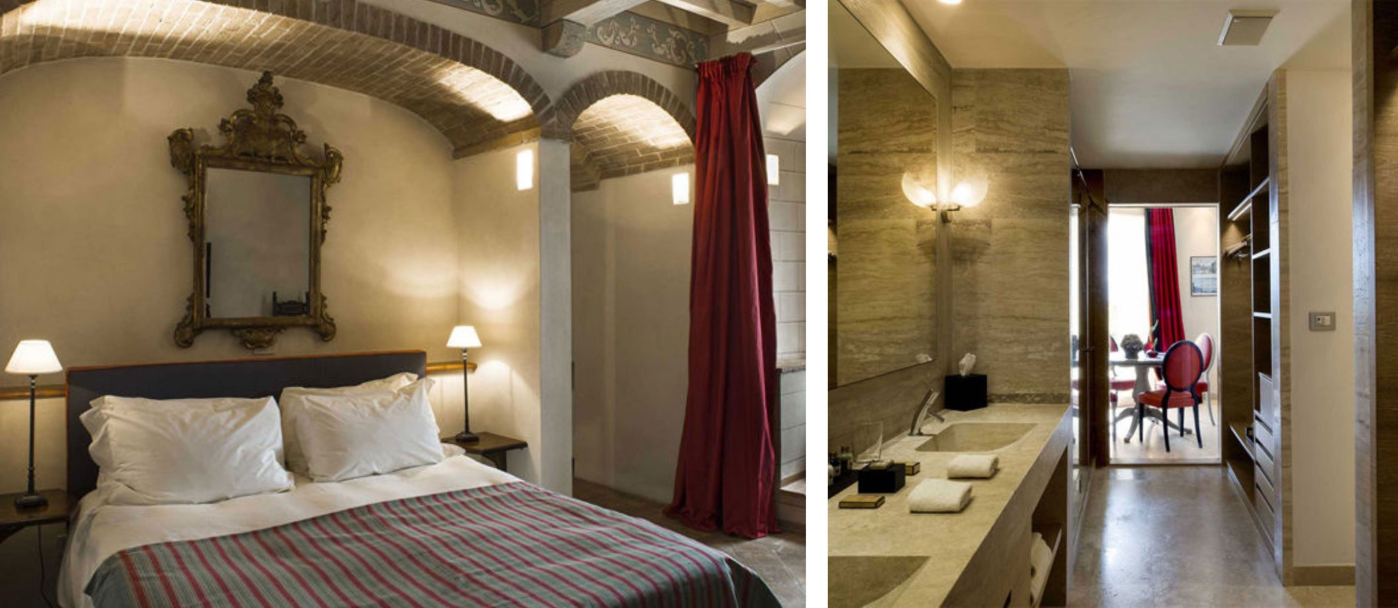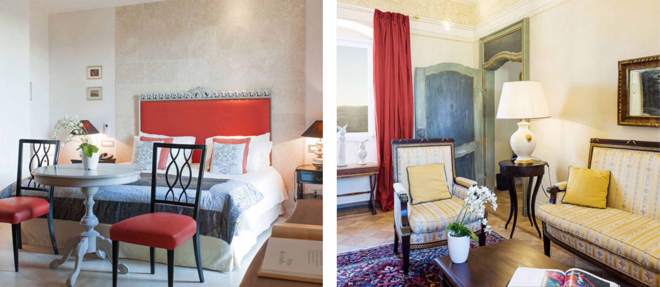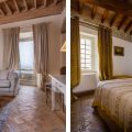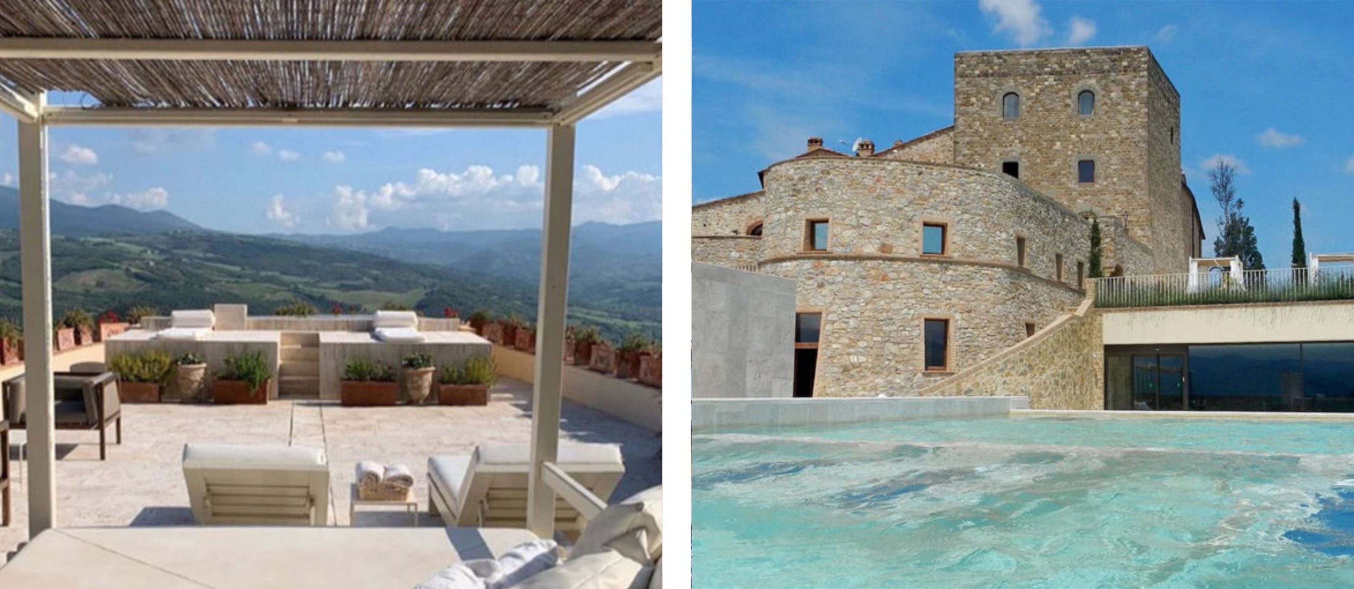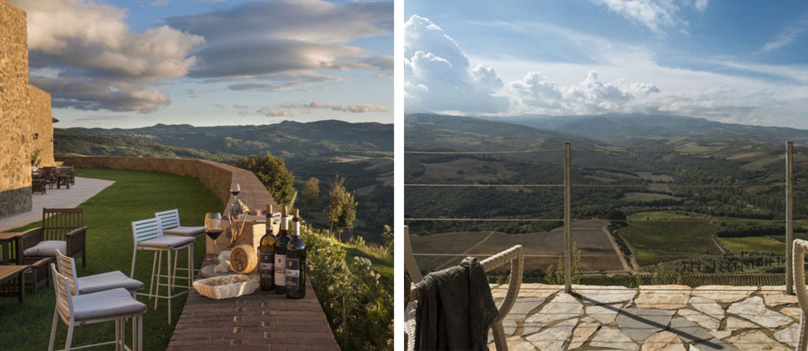 All rooms have breathtaking views over the Val d’Orcia and the Brunello of Montalcino’s vineyards and have been designed with two different concepts: Monumental Rooms (with the original Castle Tuscan style furnishing) and UNESCO View Rooms in a contemporary style, all with hot natural thermal water in their bathtubs and a private patio with a sunset breathtaking view.
