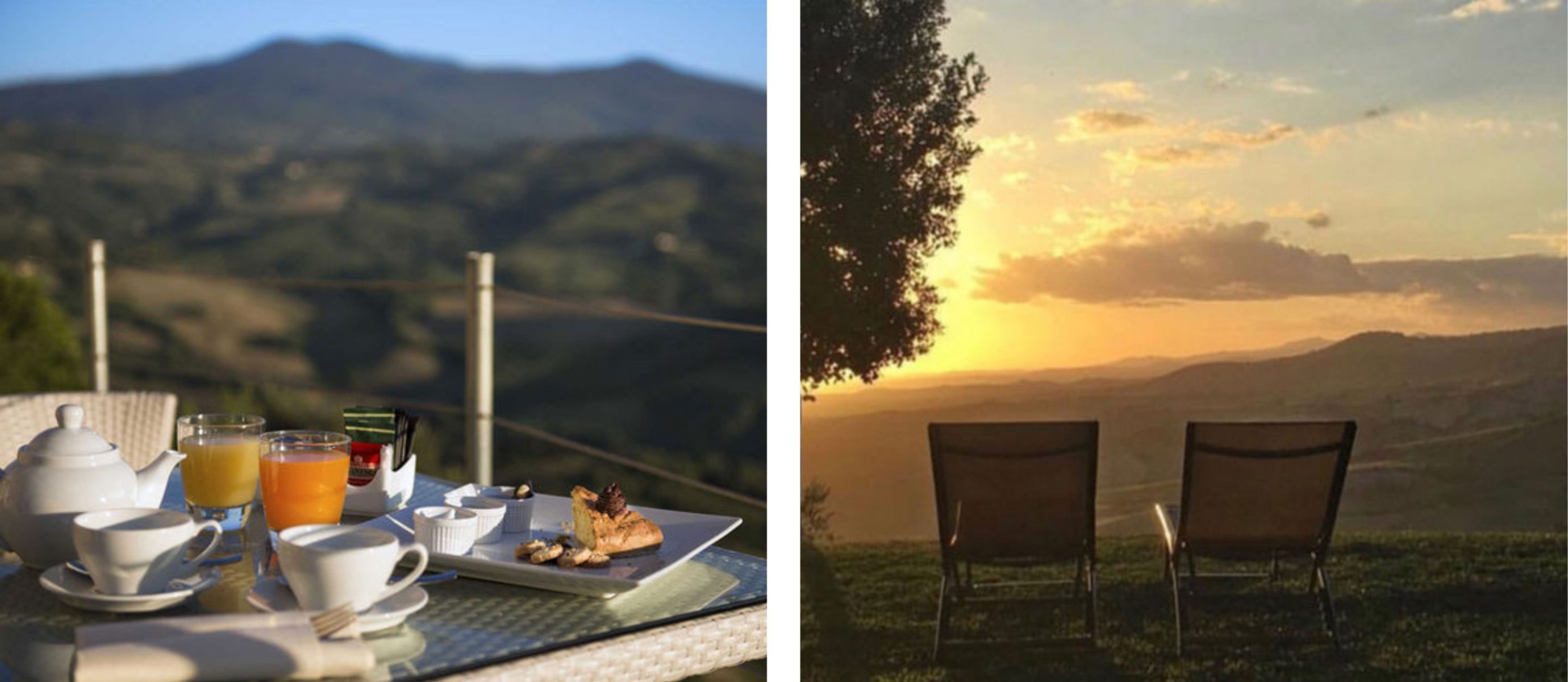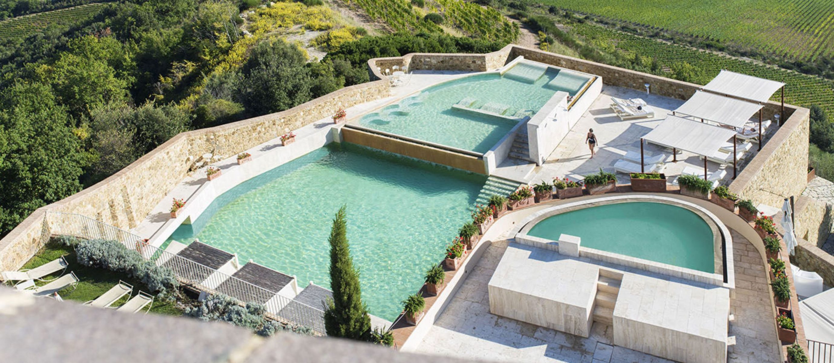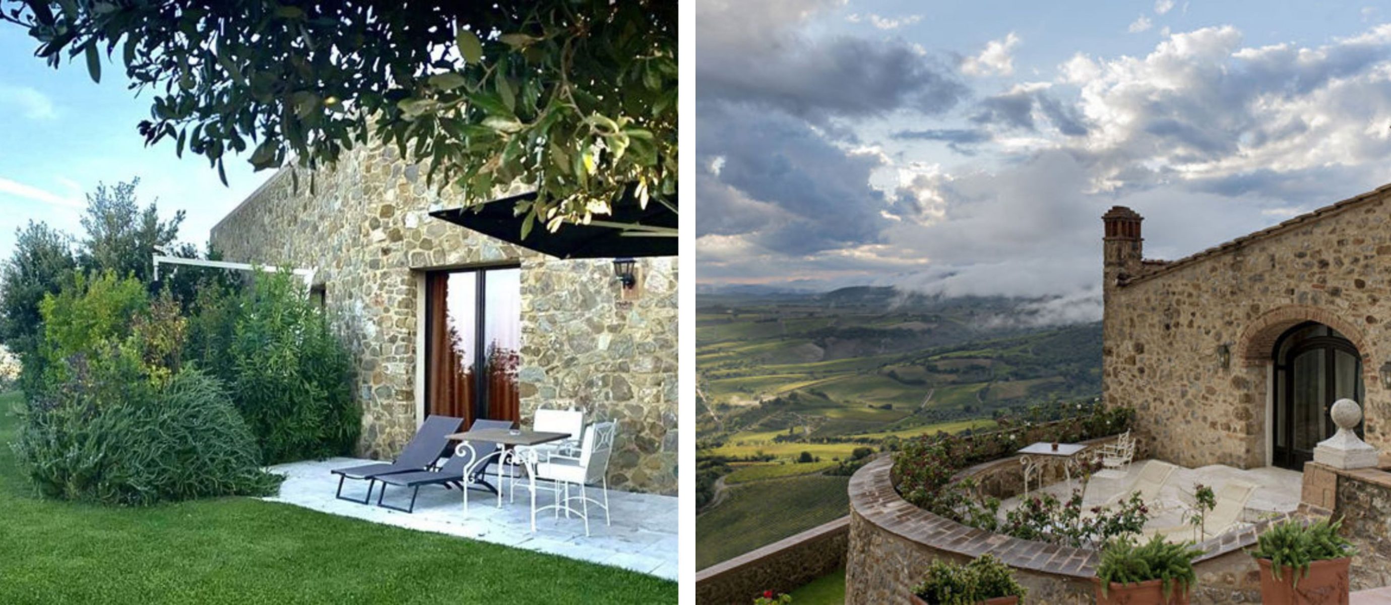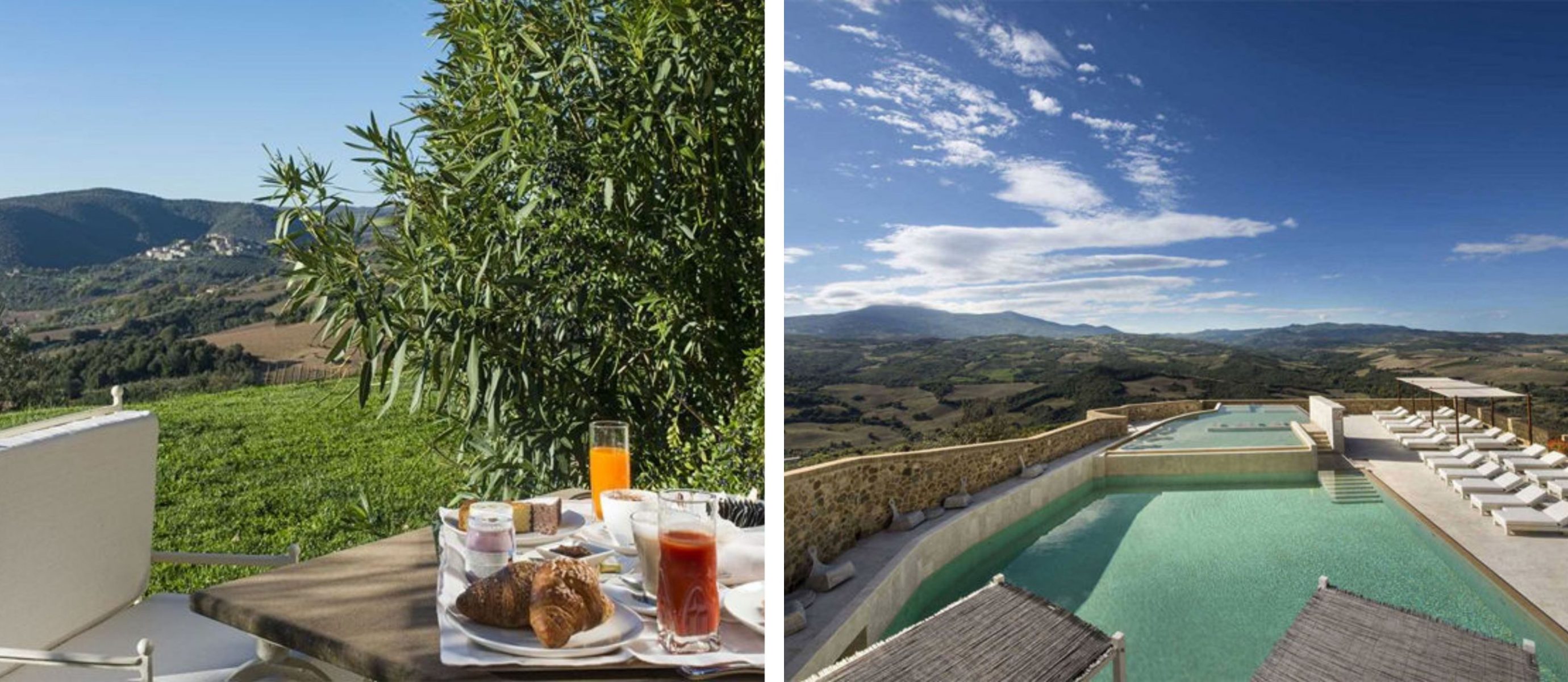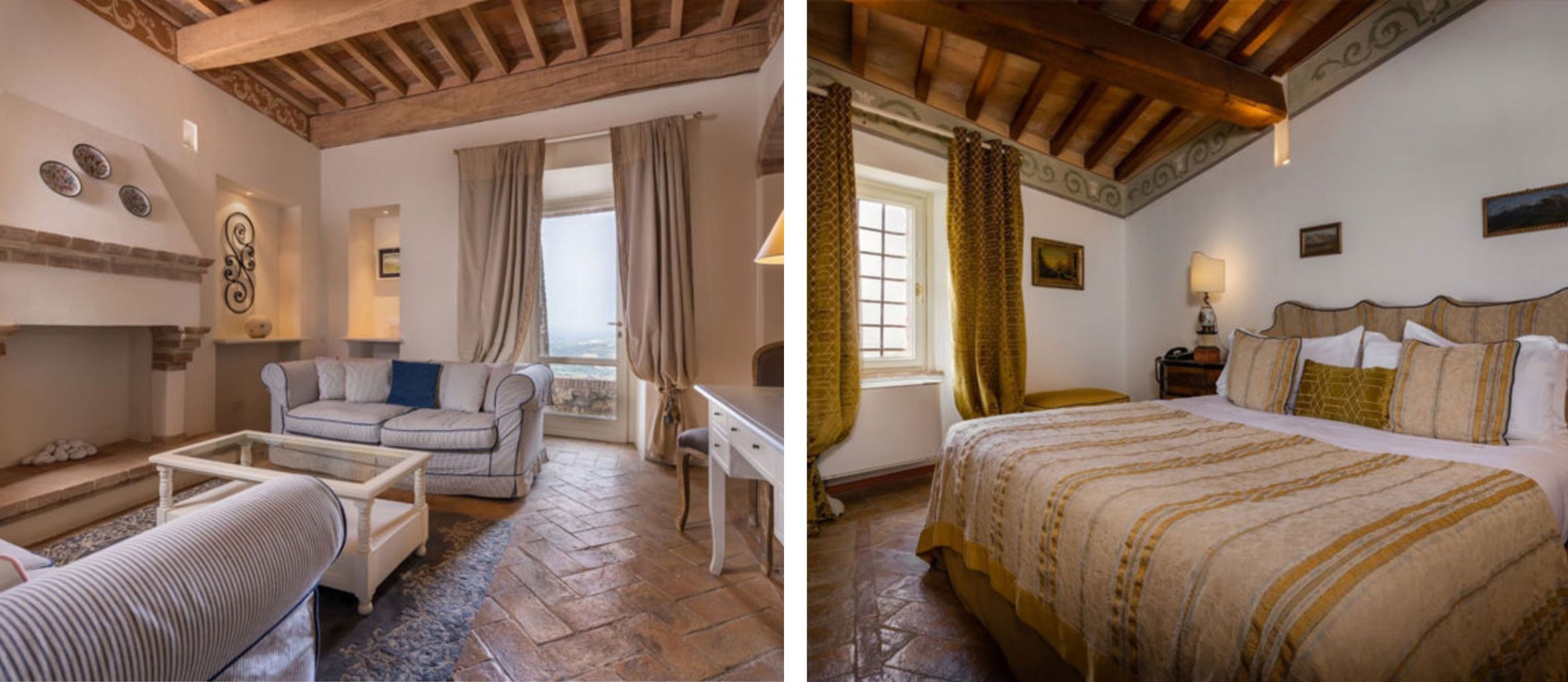 All rooms have breathtaking views over the Val d’Orcia and the Brunello of Montalcino’s vineyards and have been designed with two different concepts: Monumental Rooms (with the original Castle Tuscan style furnishing) and UNESCO View Rooms in a contemporary style, all with hot natural thermal water in their bathtubs and a private patio with a sunset breathtaking view.