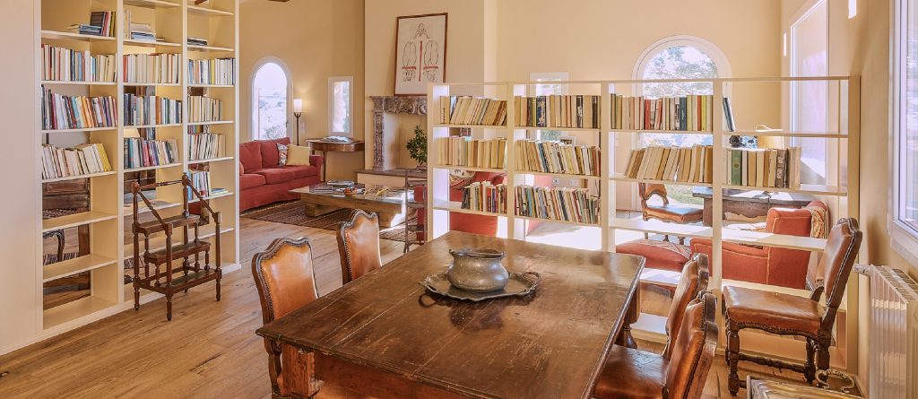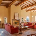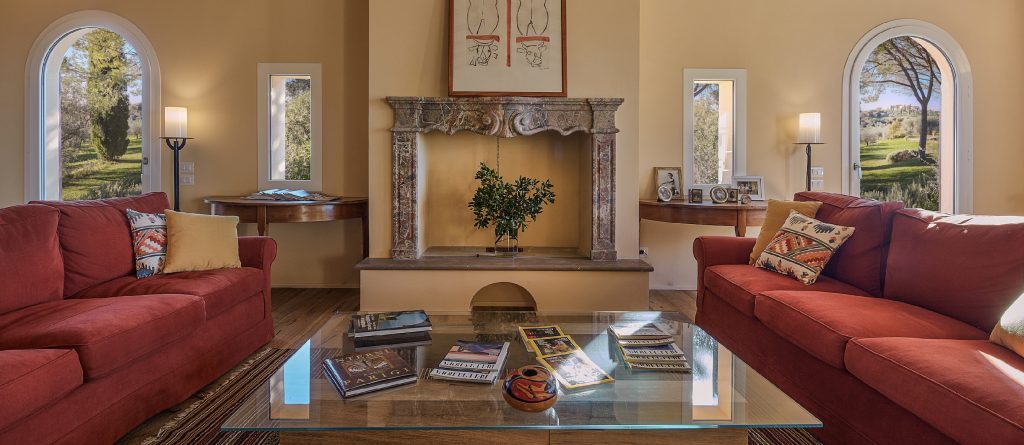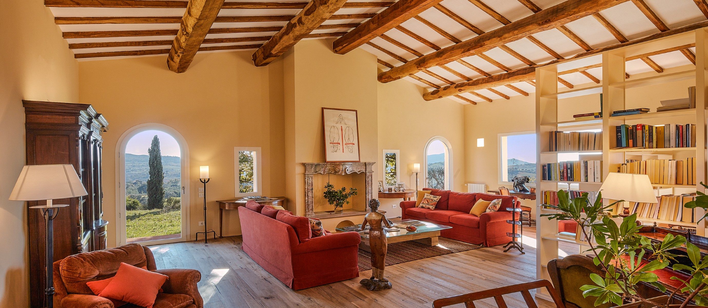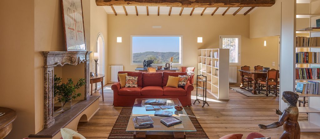 Perched atop a serene hill enveloped by olive trees, the villa boasts breath-taking panoramic views of the surrounding landscape. Ideal for families and corporate retreats alike, the villa  features an elegant yet understated design. Antique furnishings blend with contemporary elements throughout the villa, including a spacious living room with a fireplace and a library.