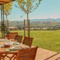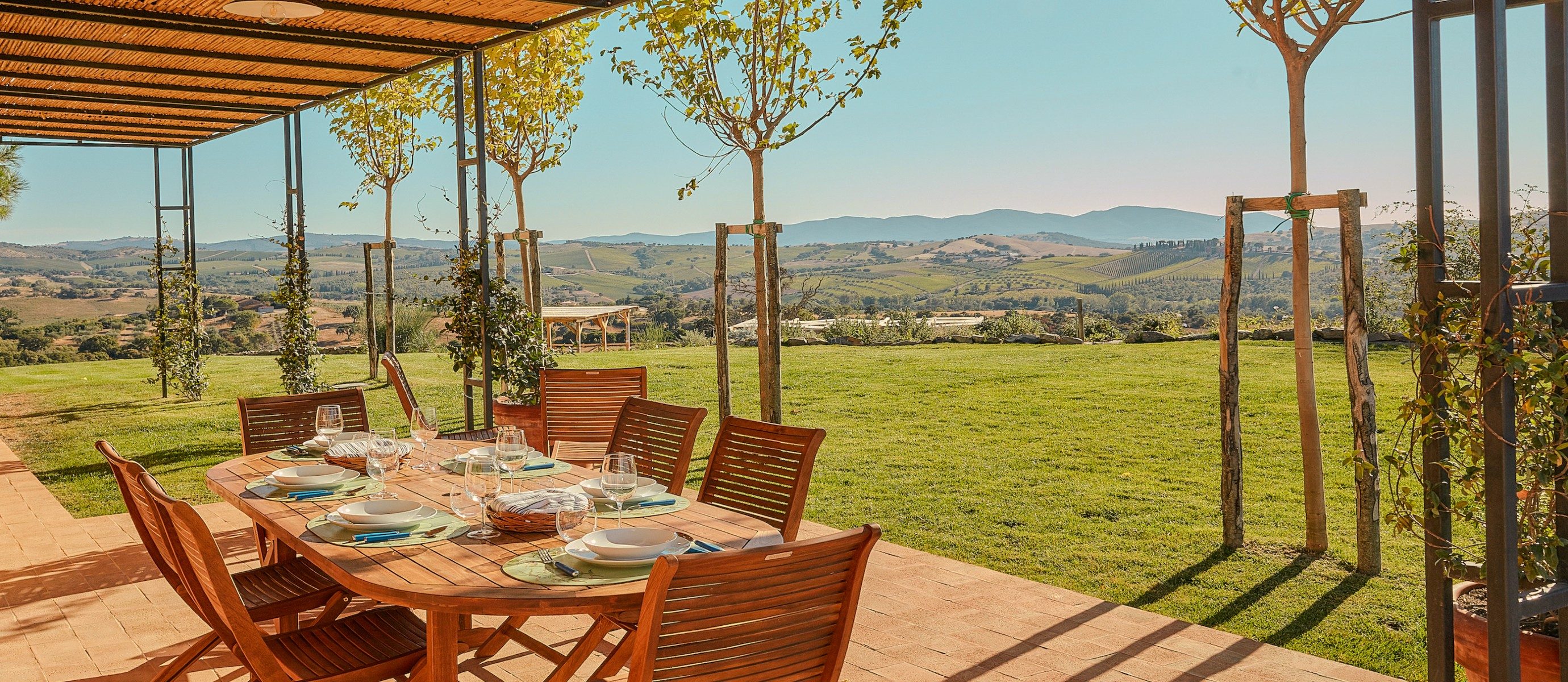 The Heart of Maremma, a traditional Tuscan villa blending rustic charm with modern comfort, featuring panoramic hilltop views, perfect for family gatherings and corporate retreats.