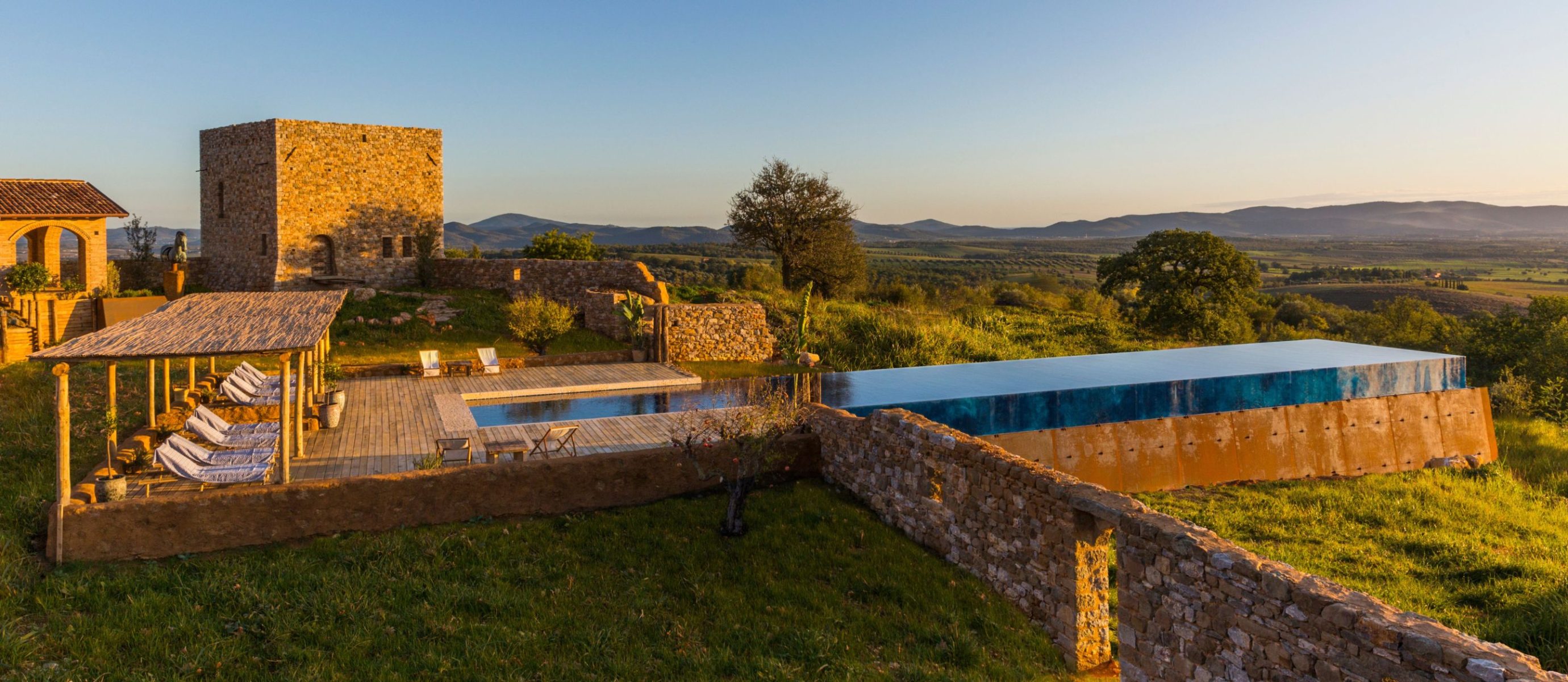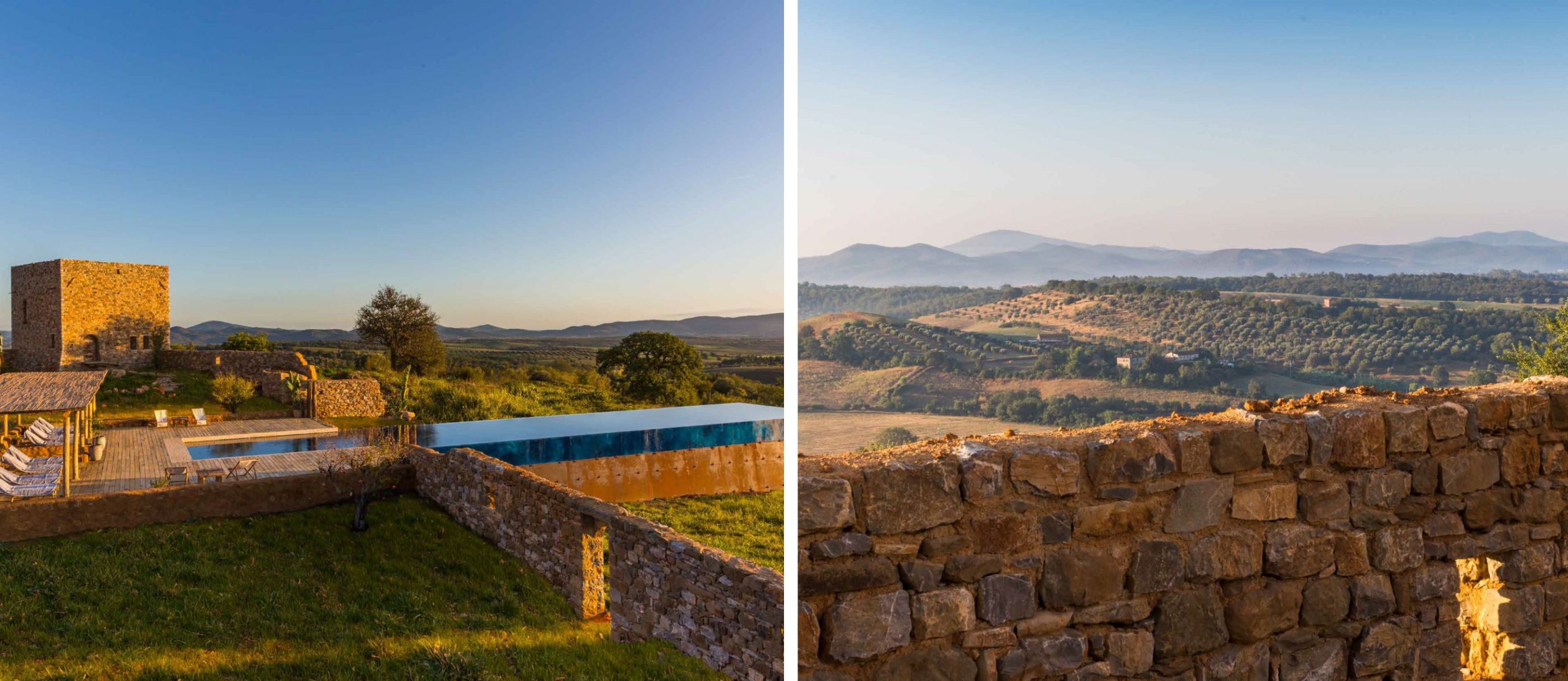 Stone, wood and iron, define and enrich the colours of the Maremma landscape, while the ever-changing blue of the swimming pool becomes a bridge to the Mediterranean Sea.